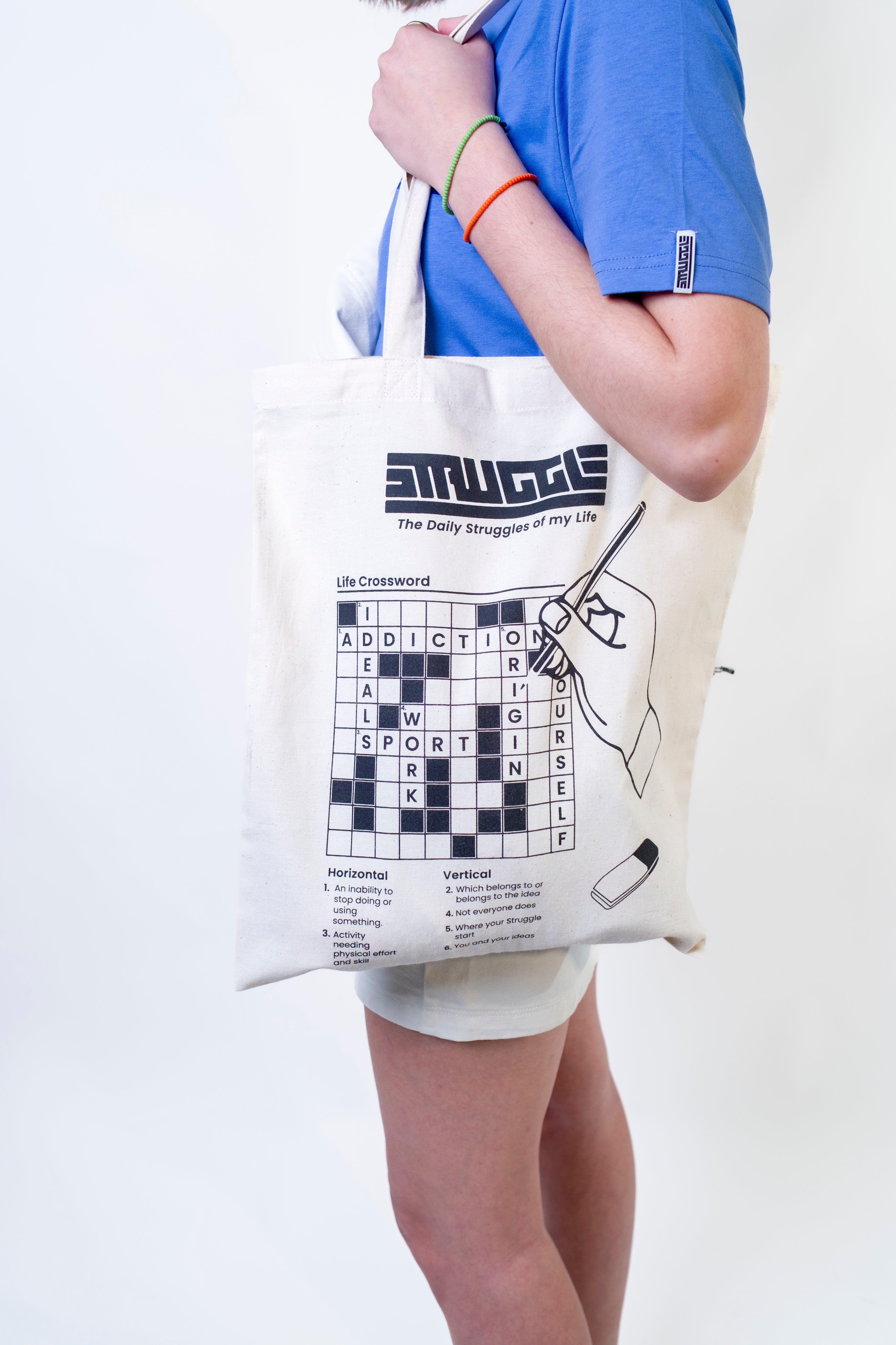 La shopper "Struggle Enigmistica" si ispira alla celebre Settimana Enigmistica, reinterpretata con un tocco Struggle, il brand che celebra le sfide quotidiane con determinazione e creatività. Realizzata in 100% cotone resistente, è perfetta per portare con te tutto l’essenziale con un design che non passa inosservato.