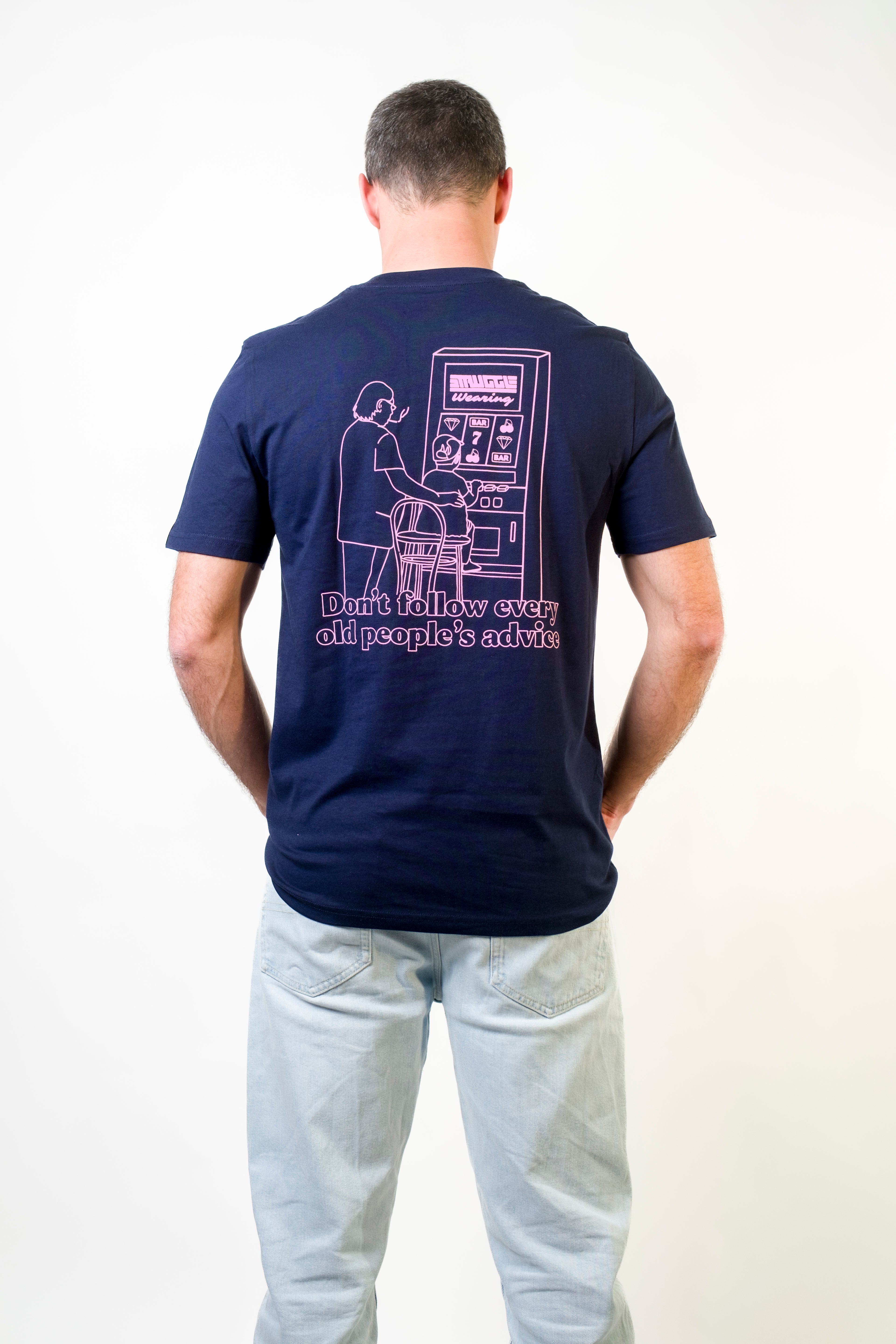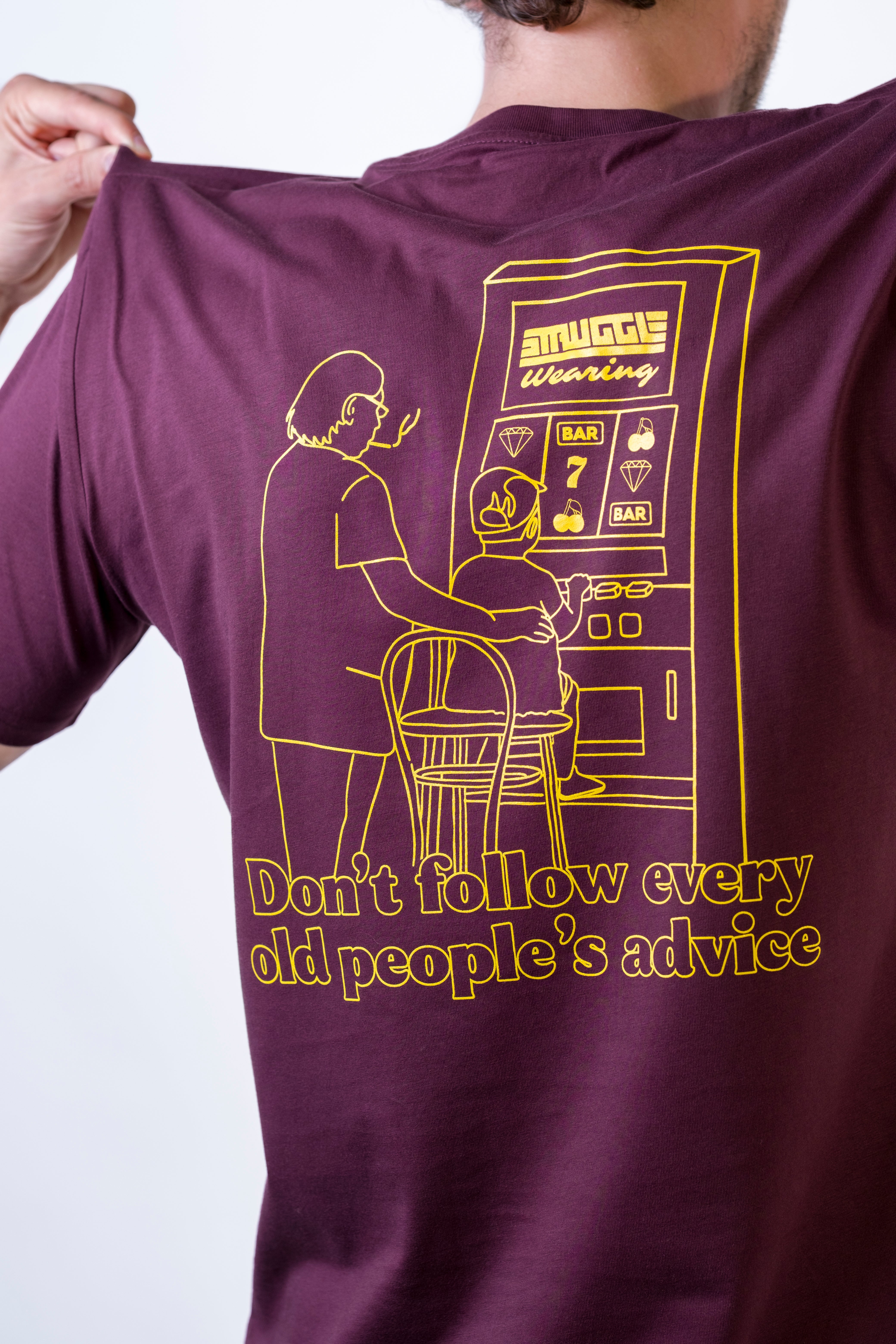 T-shirt unisex in cotone 100% regular fit, disponibile in due colori. Sul davanti a sinistra il logo Struggle da 10 cm, sul retro una grafica serigrafata ironica ma carica di verità, per un capo che unisce stile e messaggio.
